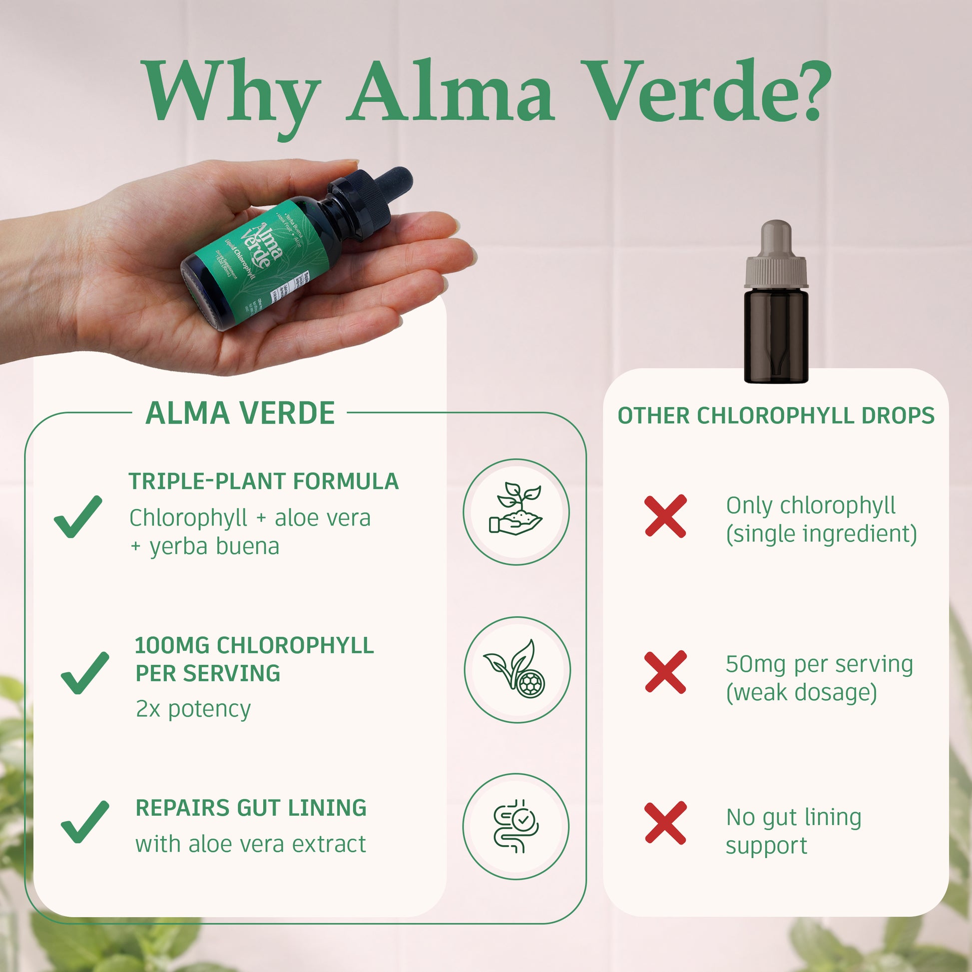 Most chlorophyll products are just chlorophyll. Alma Verde combines 100mg chlorophyll with 50mg aloe vera extract for digestive support, bloating relief, and better absorption. The aloe works with the chlorophyll to freshen your body from within while soothing your gut. One powerful dropperful.